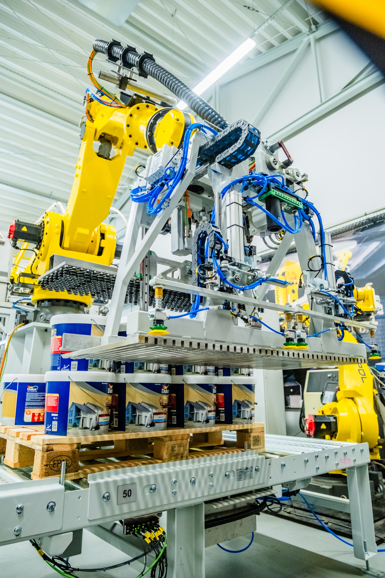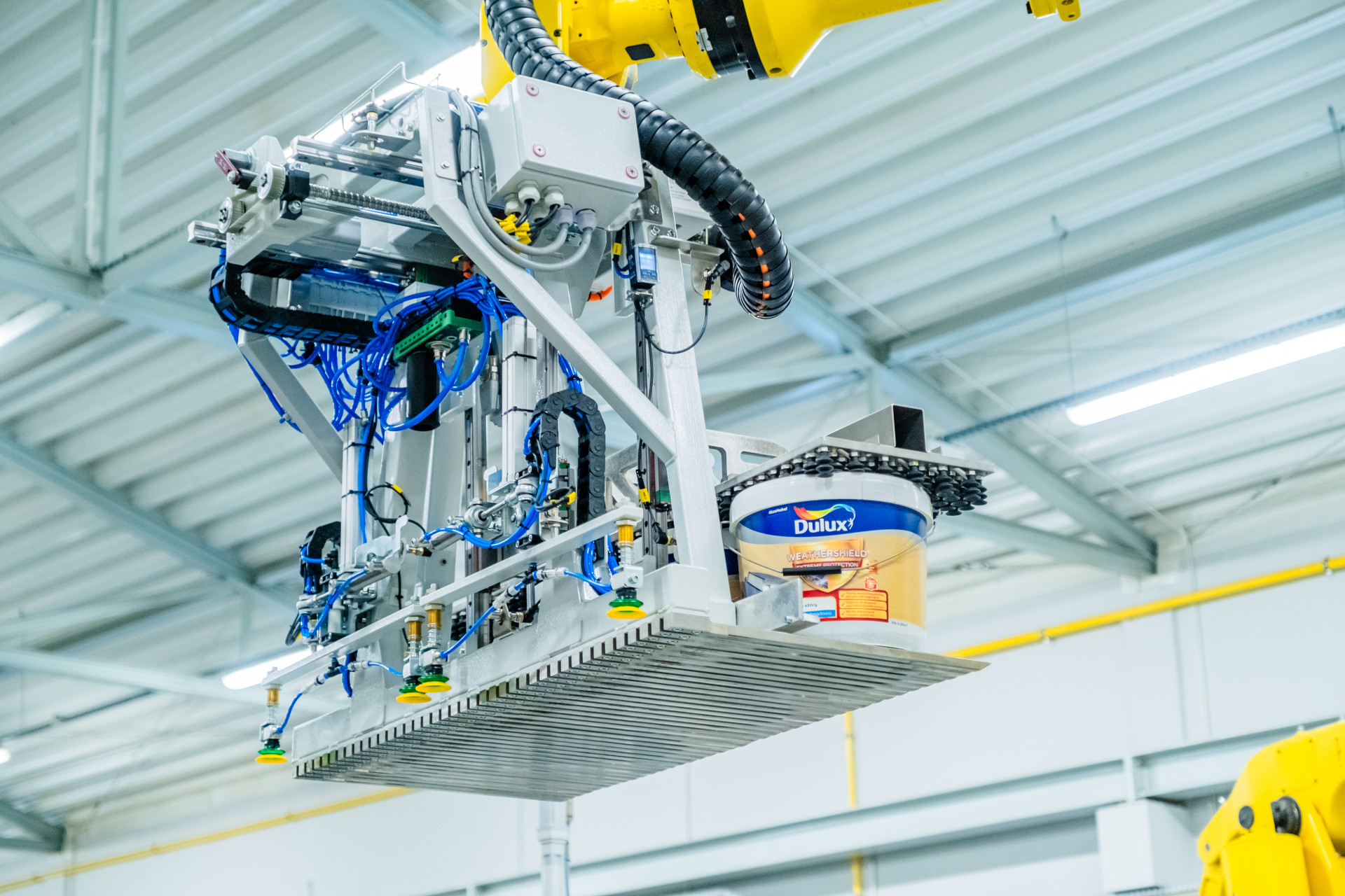 Pokaz firmy FANUC obejmował zrobotyzowane stoisko paletyzacji z robotem współpracującym CRX-25iA wyposażonym w podciśnieniowy chwytak Schmalza.